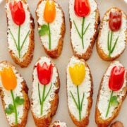 These tomato tulip crostini are the cutest spring appetizer! Easy to make and perfect for Mother’s Day brunch, Easter, baby showers, bridal showers, or any spring gathering.